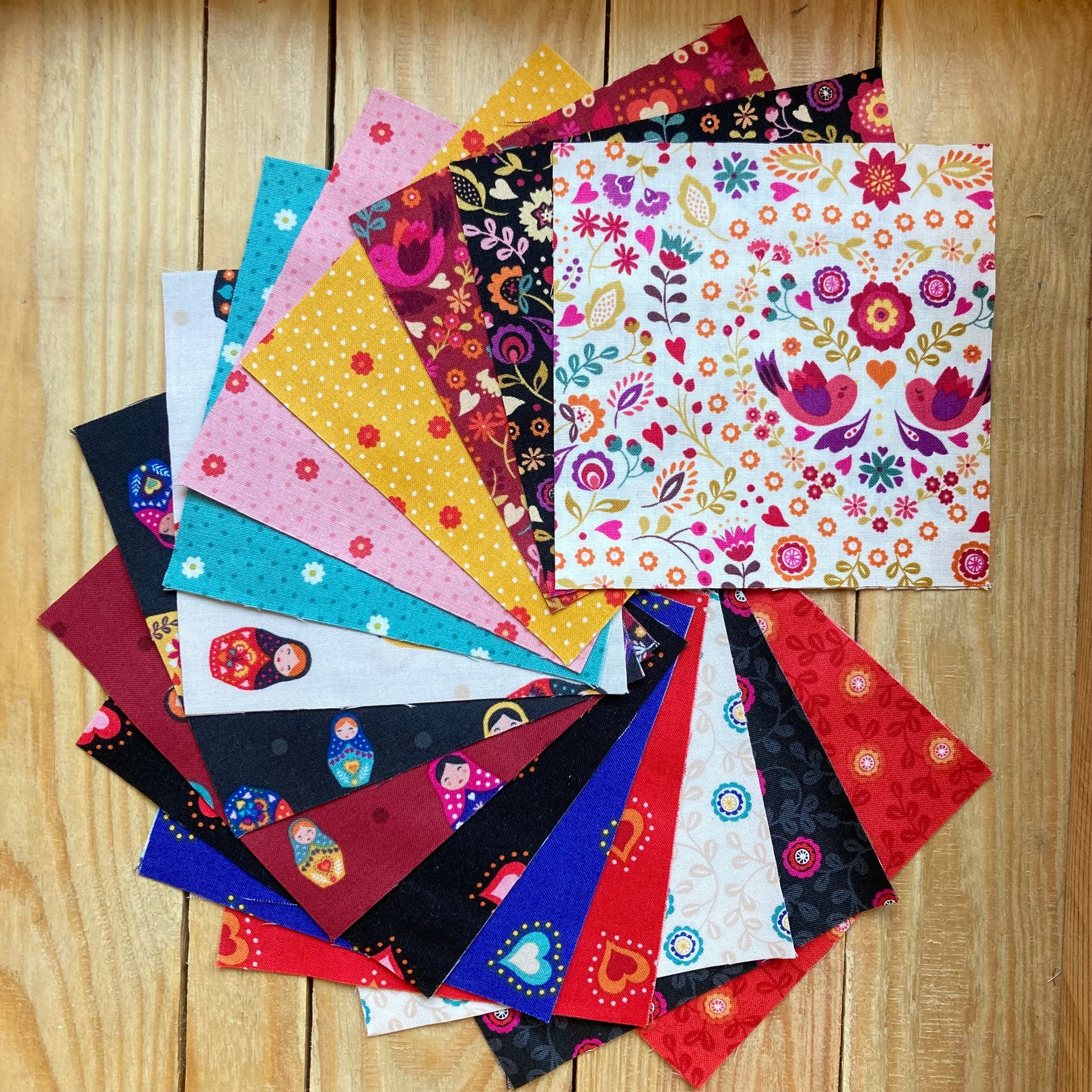 A Charm Pack of ‘Little Matryoshka’ by Lewis & Irene. You’ll find beautiful florals, hearts, Matryoshka dolls and a few sweet litle birds all in a vibrant colour palette.