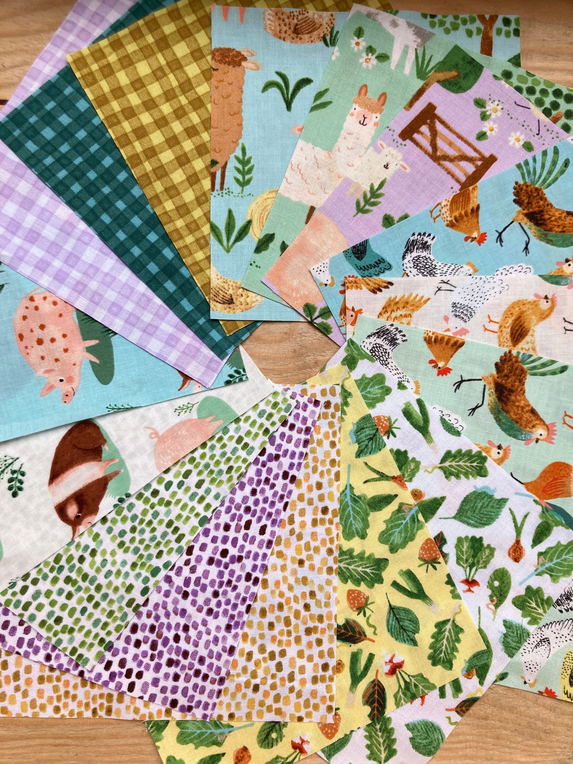 Dale Farm designed by Rebecca Jones for Clothworks features whimsical farm scenes with cows, pigs, alpacas, chickens and veggies on backgrounds of blue, green lilac and ivory. Ginghams and dots make great blenders in this range too.
