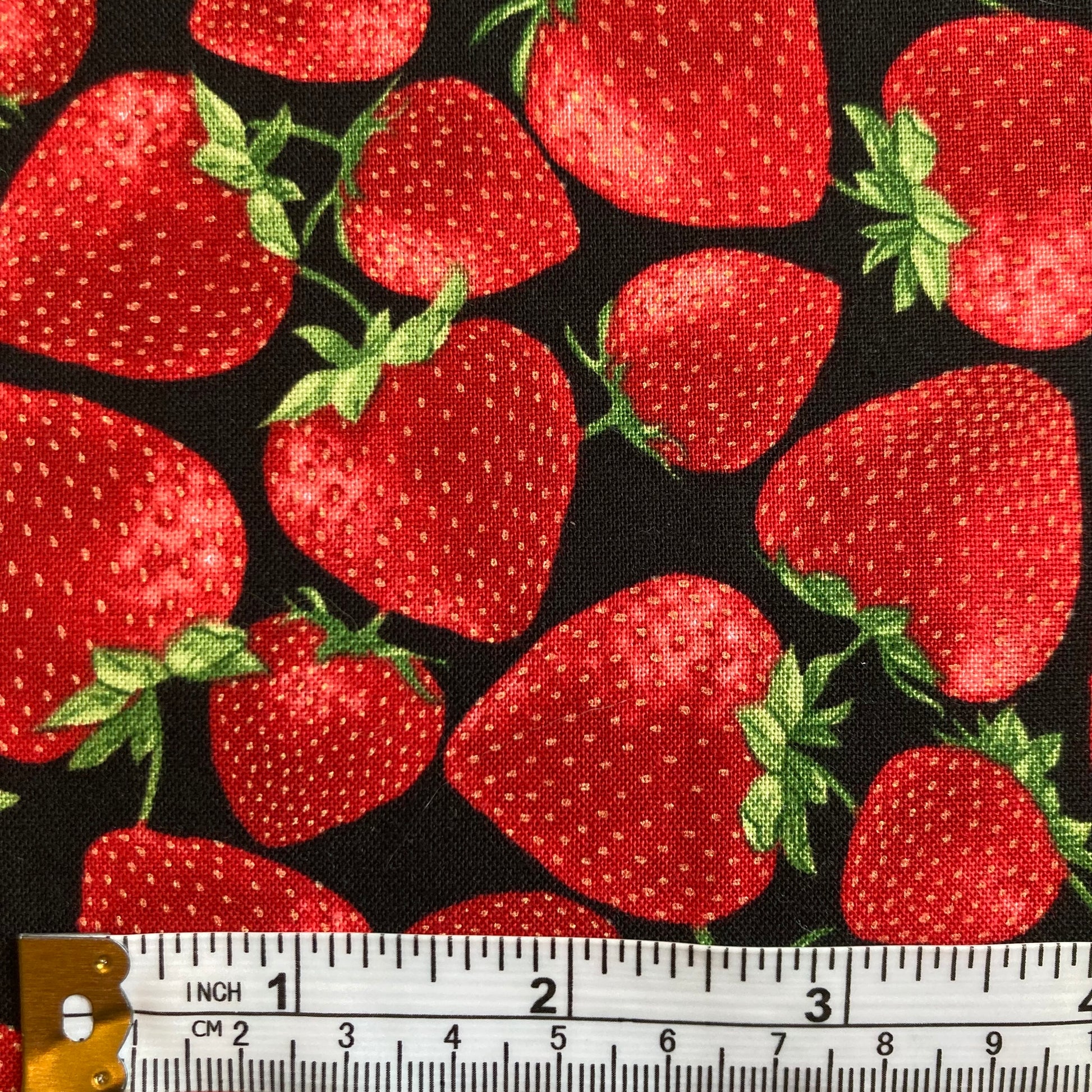 Delicious strawberries on a black background brought to you by Timeless Treasures. Perfect for fruit themed sewing and for jam jar covers.